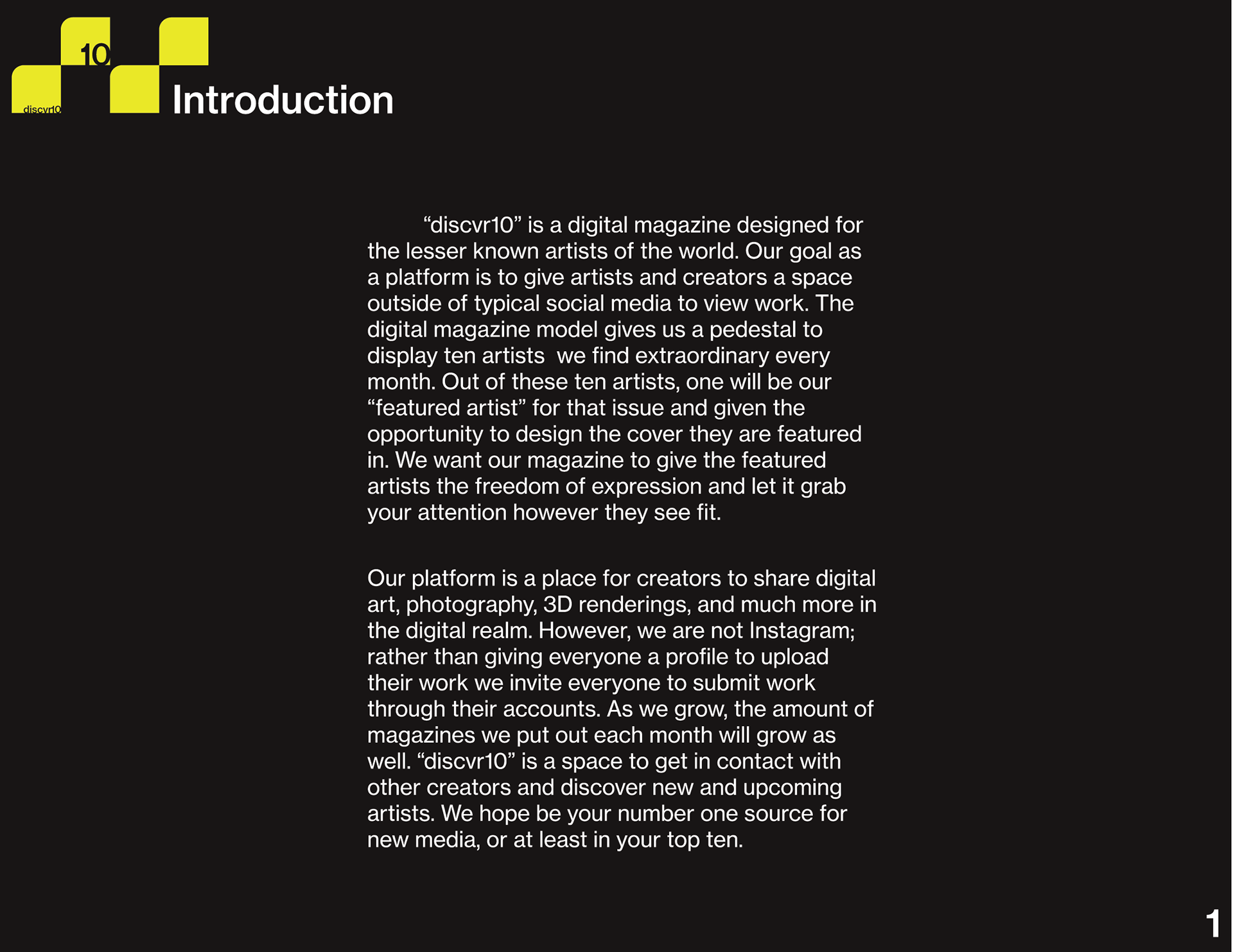 The name "discvr10" implies the main function of the magazine: to highlight 10 up and coming creatives. For each issue, one of the ten chosen artists will be tasked with designing the cover for the upcoming installment, and will be considered the featured artist.